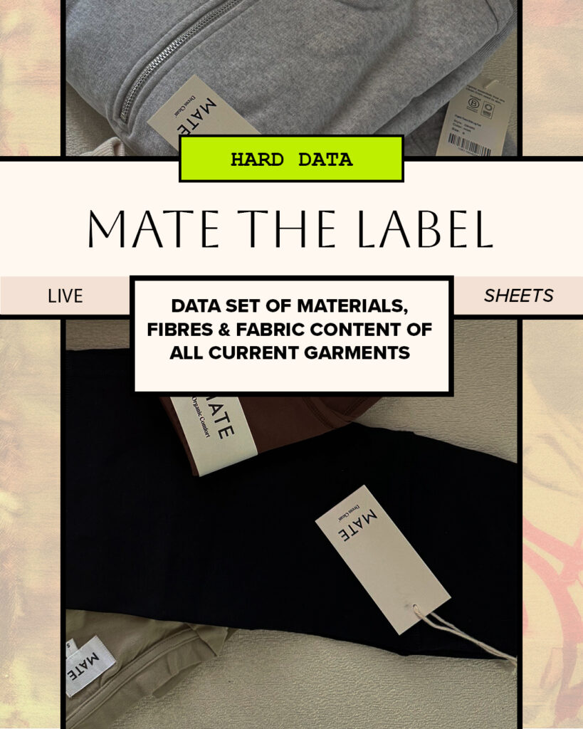 Mate The Label Clothing Data: Materials, Fibres & Fabric Content of all Current Garments